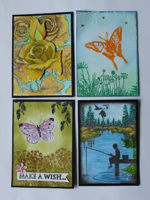 I have a lot of stencils, but realised, that I didn't use them for a while. So here 2 cards, mainly with stencils, and with Distress inks. I do hope you like them.